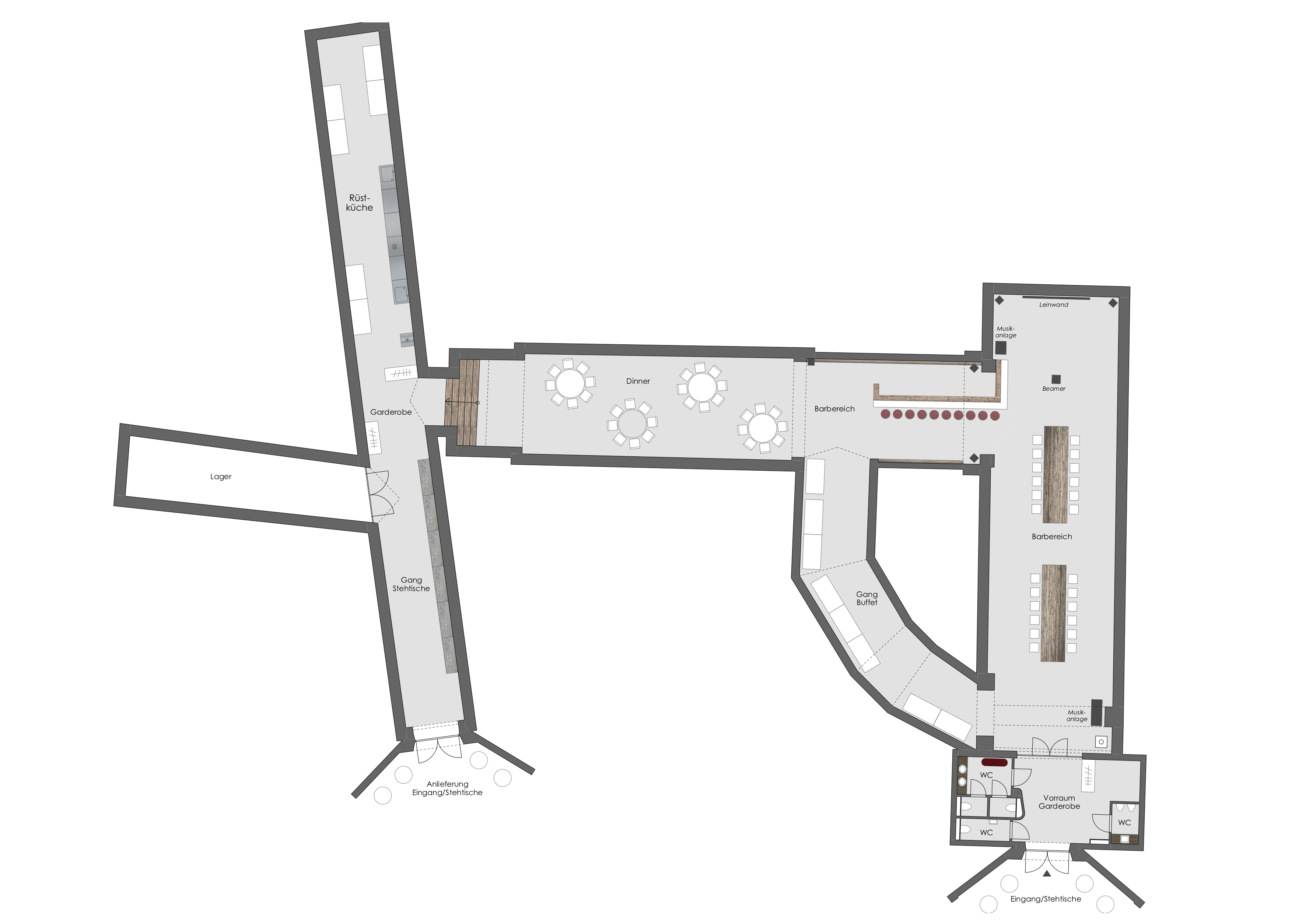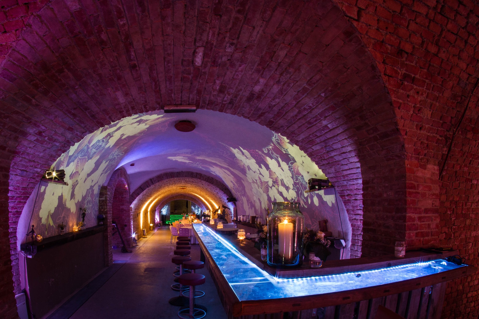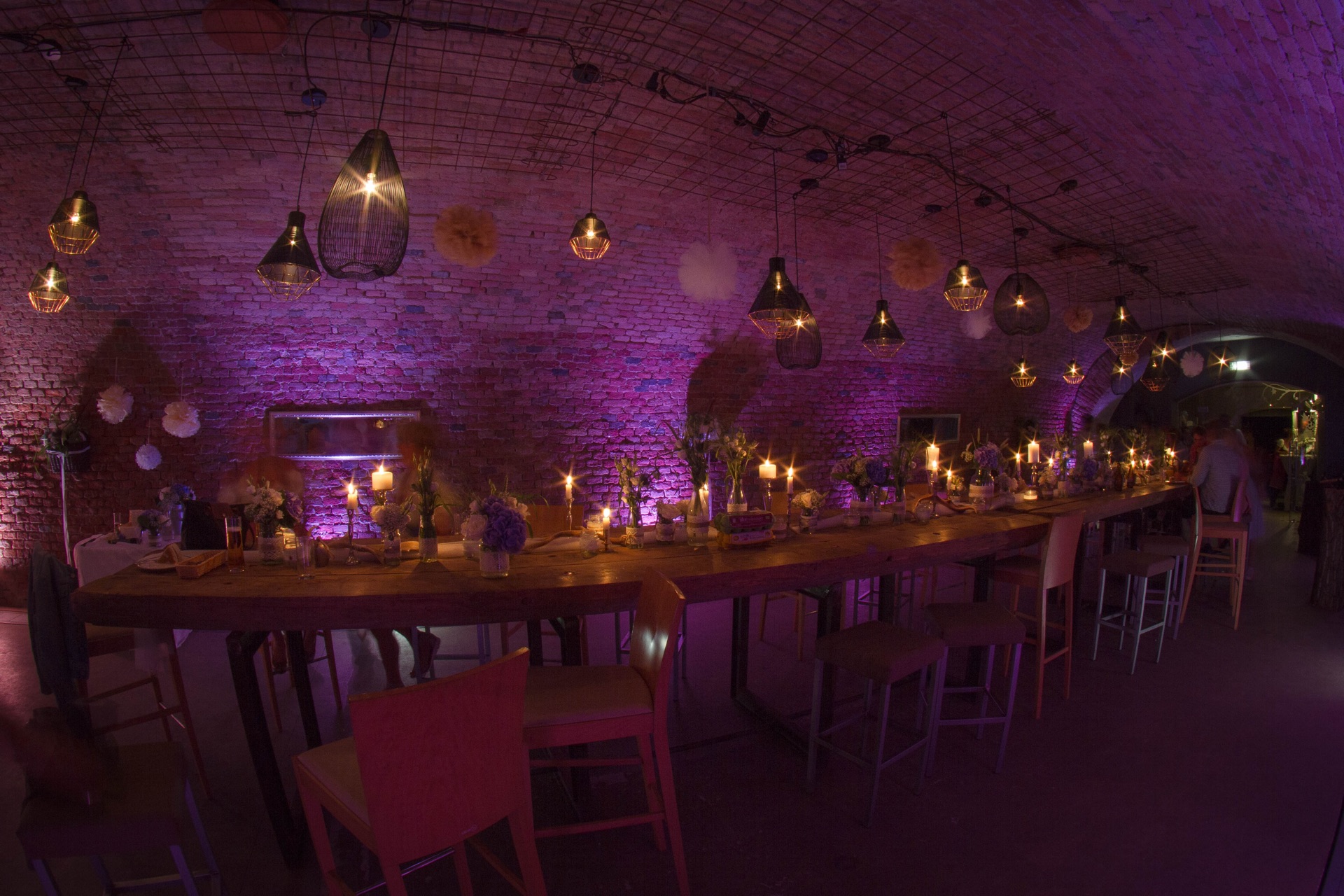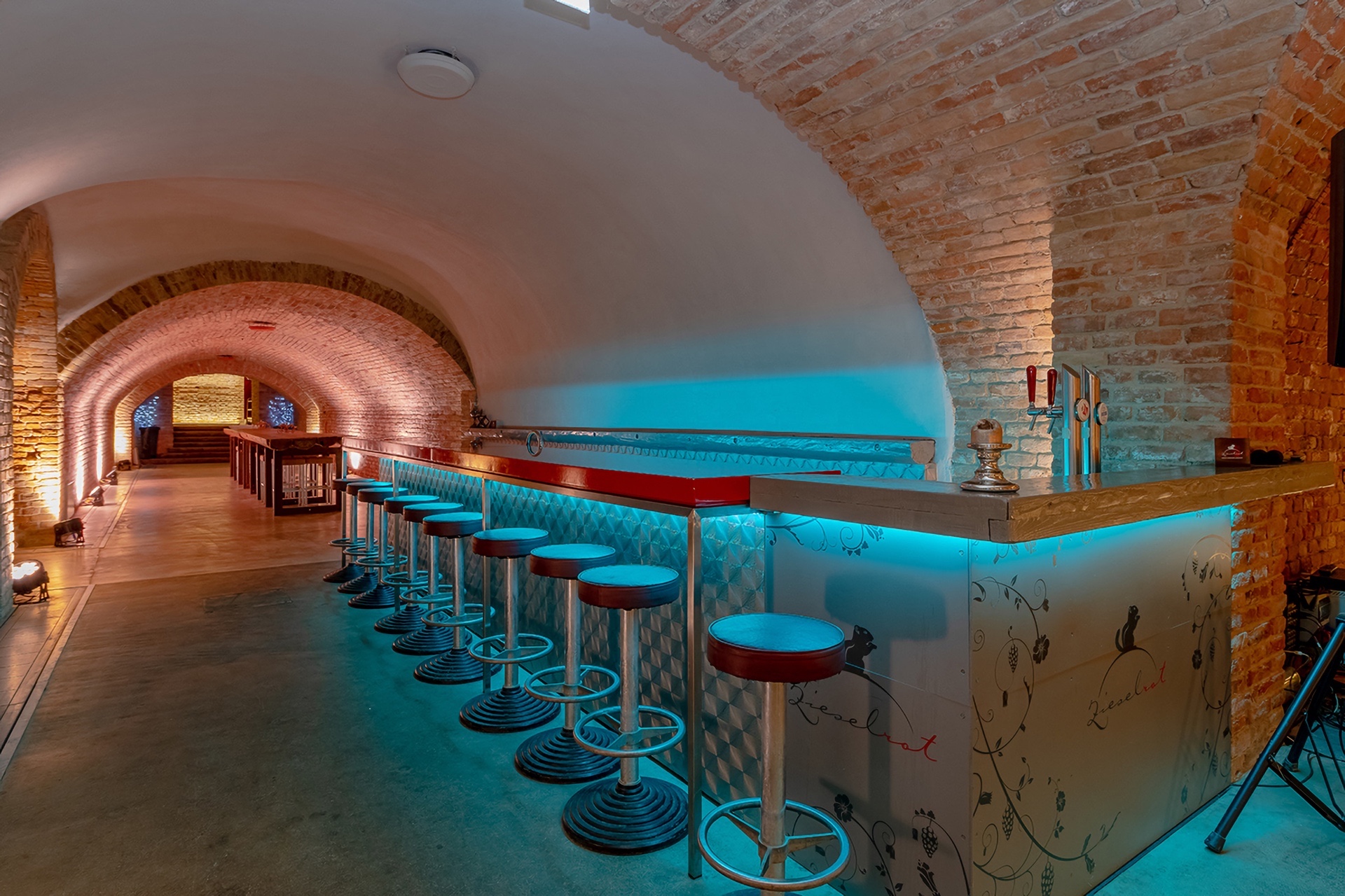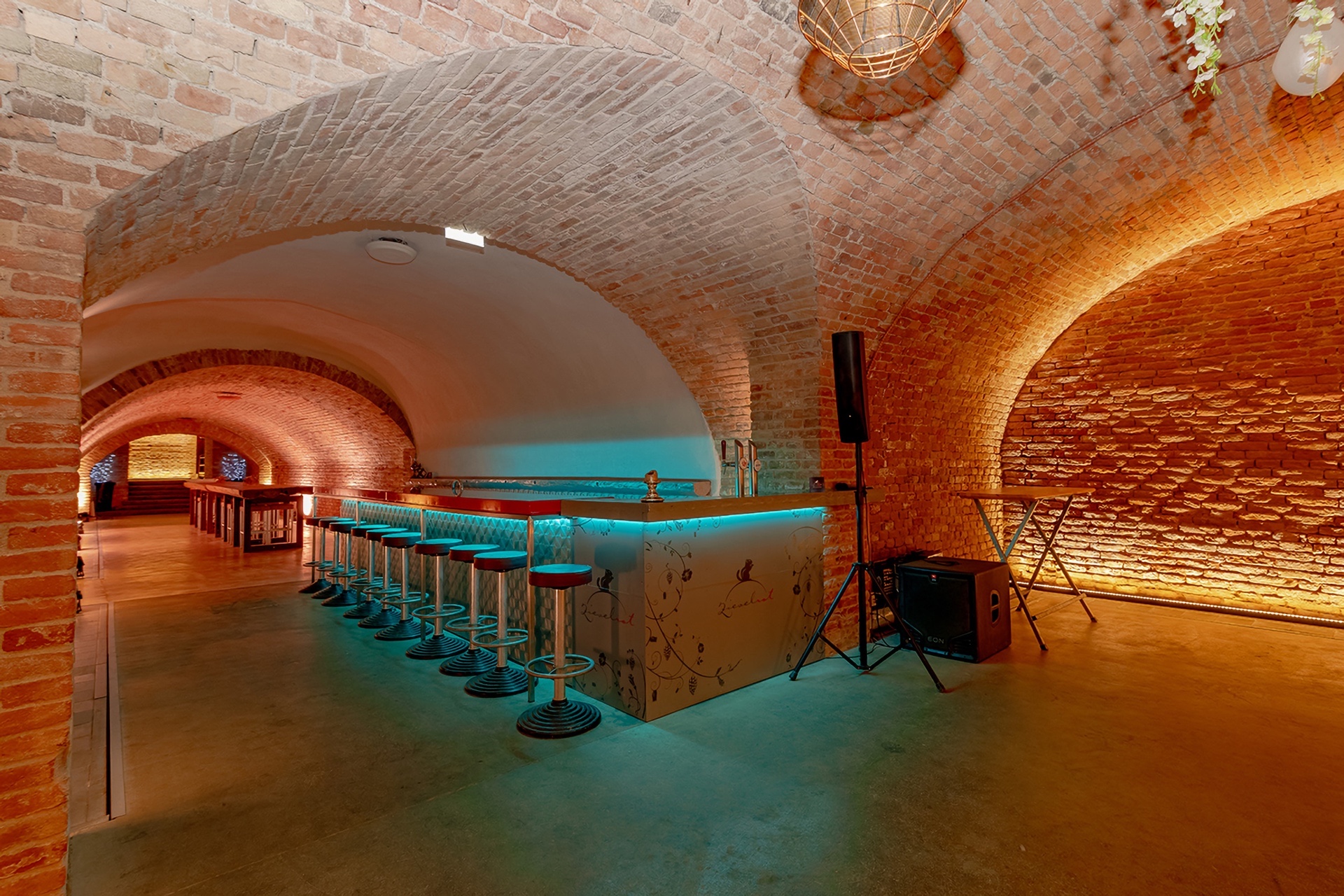 Eine Veranstaltung braucht Platz – genug, um sich entfalten zu können, aber nicht zu viel, sonst zerfällt sie. Das große Gewölbe von Zieselrot ist ein spannender Ort mit vielen Nischen und Gängen, die zum Verweilen und Lustwandeln einladen. Überall bieten sich Möglichkeiten, Ideen umzusetzen – die geschickte Aufteilung lässt verschiedenste Eventkonzepte zu. Sei es eine Gala mit Bankettbestuhlung, ein Fest mit Tanzfläche, ein gesetztes Essen, oder ein Vortrag mit Sitzreihen. Alles ist möglich.